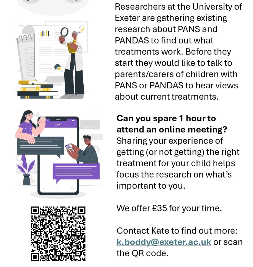 There is an opportunity for a small number of parents and carers of children who have PANS or PANDAS to get involved in the early stages of this project. Researchers at the University of Exeter would like to talk to parents/carers of children with PANS or PANDAS to hear their views about current treatments.